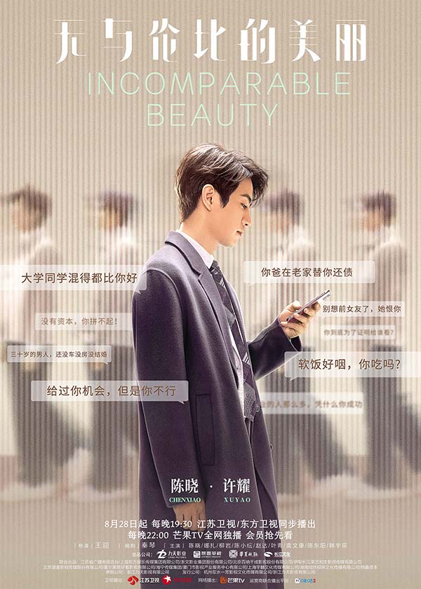 由浙江力天影视有限公司,浙江晟喜华视文化传媒有限公司,东阳华夏视听影视文化有限公司,北京长江文化股份有限公司出品的都市情感剧《无与伦比的美丽》定于8月28日登陆江苏卫视、东方卫视每晚黄金强档播出,芒果TV全网独播。本剧由王迎执导,陈晓、娜扎、柳岩、陈小纭等主演,讲述了当代青年在奋斗成长中的困境与焦虑、自洽与和解。