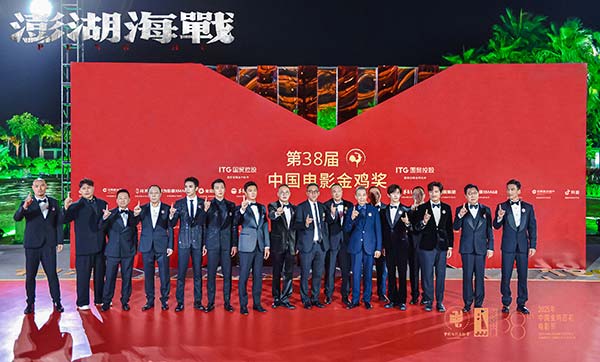 于厦门举行的第38届中国电影金鸡奖闭幕红毯上,电影《澎湖海战》一众主创统一身着黑色西装,佩戴着“澎湖海战定制版”徽章,其船帆上的红色“统”字格外醒目。拍照环节中,影片众主创目光坚定,集体比出“1”字手势,紧扣影片主题。